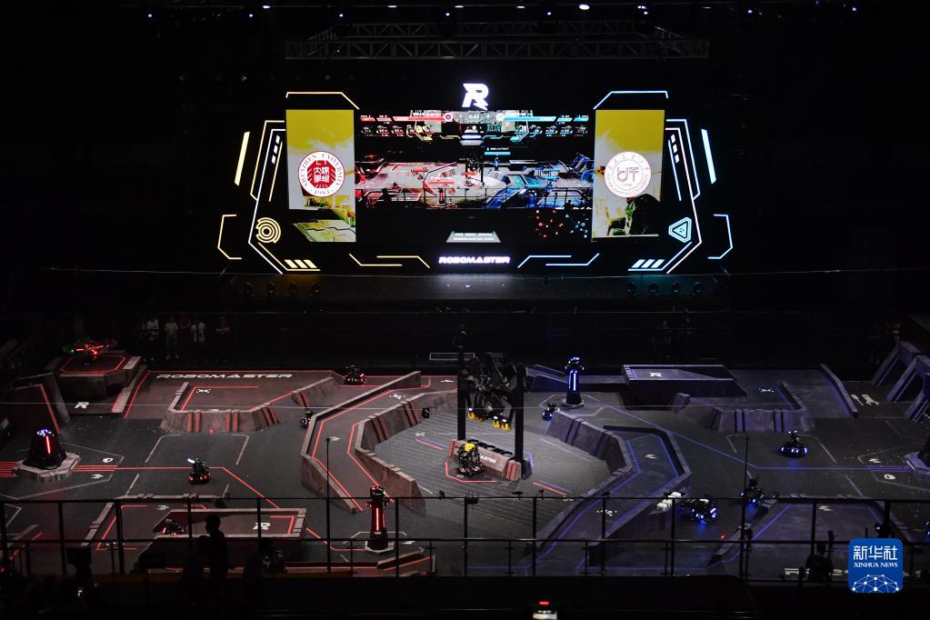 5月28日,大連交通大學(xué)TOE戰隊(藍方)和深圳大學(xué)RobotPilots戰隊(紅方)的機器人在比賽中交鋒。