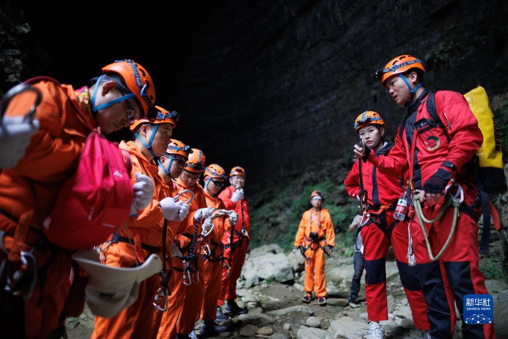 游客在貴州省綏陽(yáng)縣地下裂縫景區體驗洞穴探險前接受教練的培訓指導(5月17日攝)。