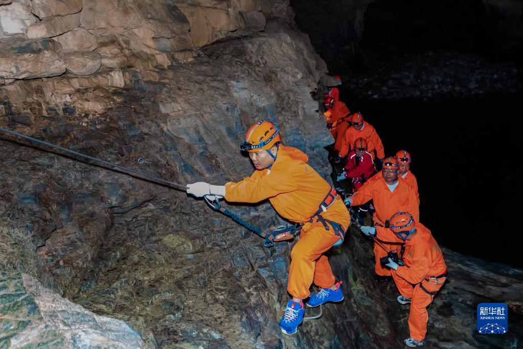 游客在貴州省綏陽(yáng)縣地下裂縫景區體驗洞穴探險(5月17日攝)。