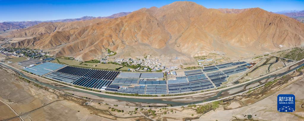 這是5月28日拍攝的白朗縣珠峰博覽園,目前園區共有高標準溫室大棚133座(無(wú)人機拼接照片)。