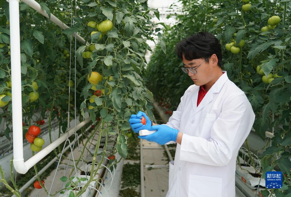 5月28日,在位于平谷區峪口鎮的京瓦溫室園藝示范園,西樊各莊科技小院駐村大學(xué)生王萌測量番茄果實(shí)的可溶性糖含量。