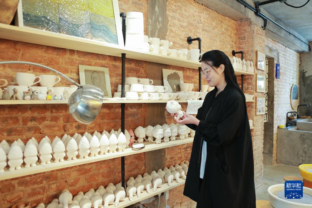 5月24日,在衢州市龍游縣溪口未來(lái)鄉村黃泥山片區,創(chuàng )業(yè)者吳琴芬在文創(chuàng )工作室內查看作品。新華社記者 鄭衛 攝