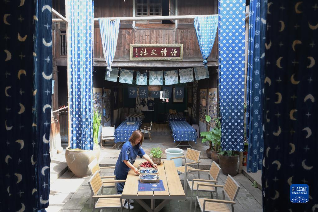 5月23日,在義烏市李祖村,“沙漠的染坊”主理人的母親在店內整理桌面。新華社記者 杜瀟逸 攝