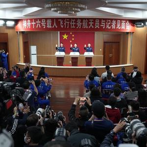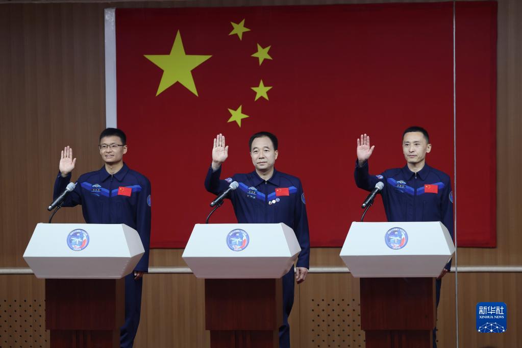 5月29日,神舟十六號航天員乘組與中外媒體記者集體見(jiàn)面會(huì )在酒泉衛星發(fā)射中心問(wèn)天閣舉行。這是指令長(cháng)景海鵬(中)、航天飛行工程師朱楊柱(右)、載荷專(zhuān)家桂海潮揮手致意。