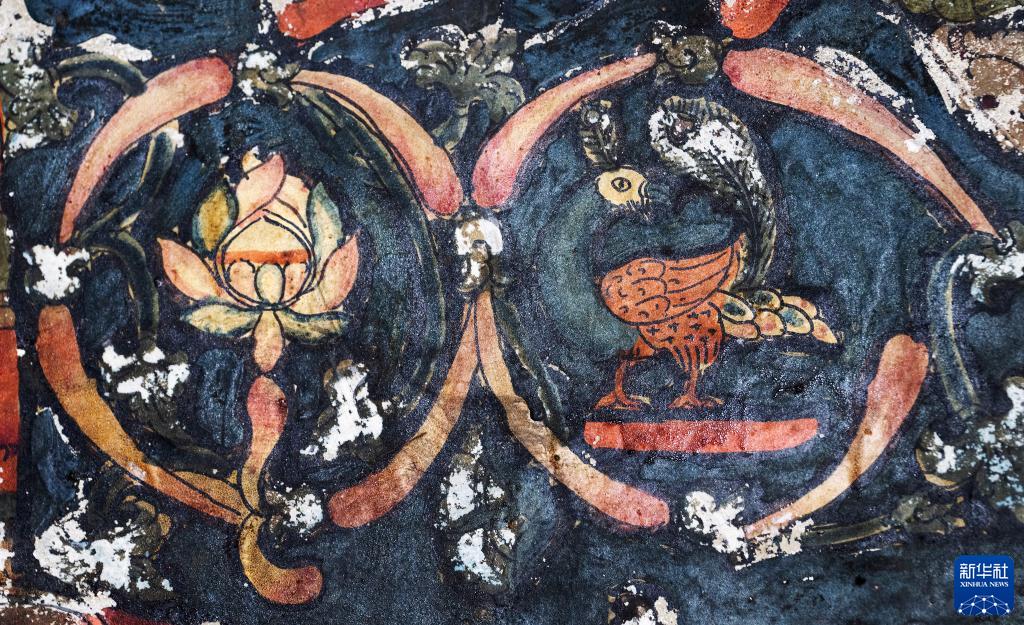 這是5月26日拍攝的皮央石窟壁畫(huà)中的孔雀像。