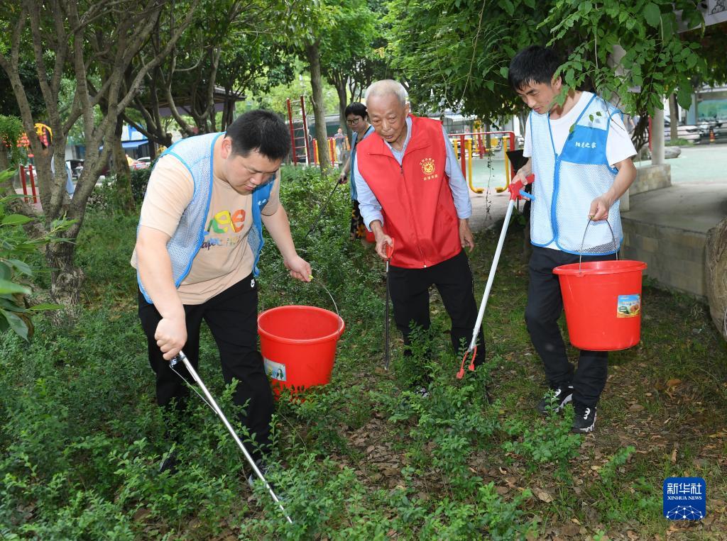 5月29日,在湖州市環(huán)渚街道玉堂橋社區,凌法林(中)帶領(lǐng)殘障人士參與到社區日常保潔工作中。