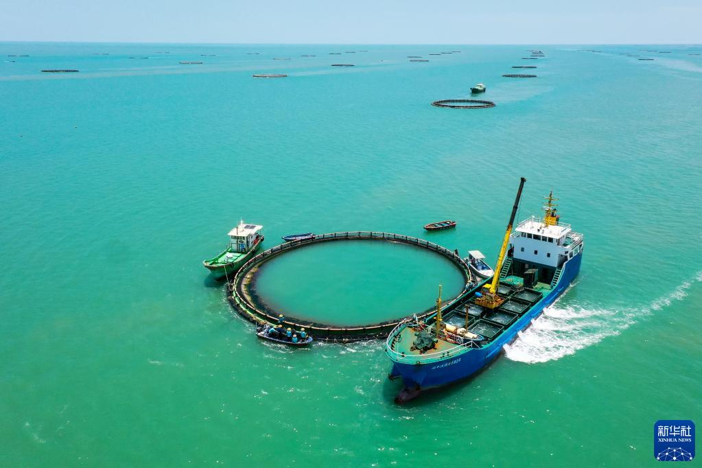 在湛江市徐聞縣西連鎮,徐聞國橋深海養殖有限公司的金鯧魚(yú)深海網(wǎng)箱整齊排列(5月27日攝,無(wú)人機照片)。