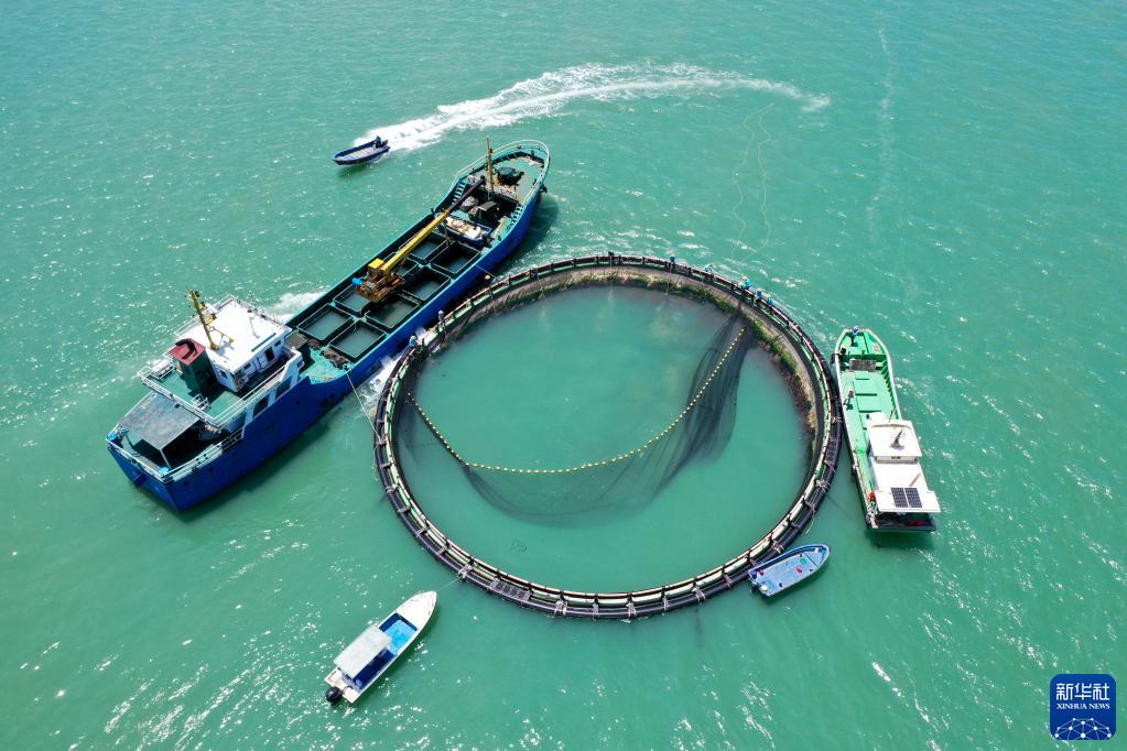 5月27日,在湛江市徐聞縣西連鎮,漁業(yè)工人在深海網(wǎng)箱拉網(wǎng)收獲金鯧魚(yú)(無(wú)人機照片)。