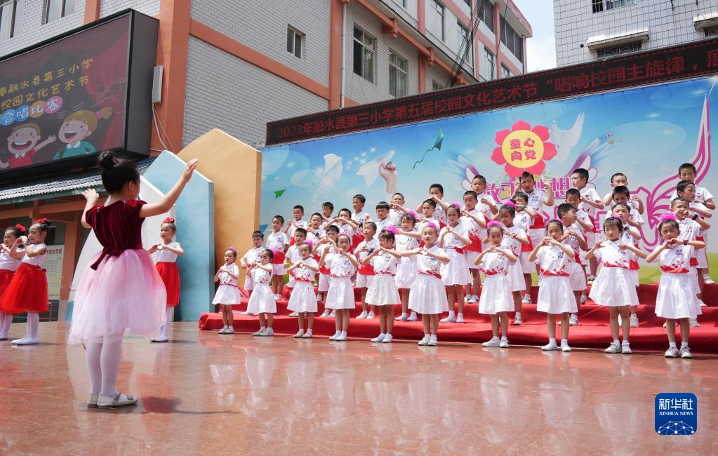 5月29日,廣西柳州市融水苗族自治縣第三小學(xué)學(xué)生在“慶六一”文化藝術(shù)節合唱比賽上演唱歌曲。