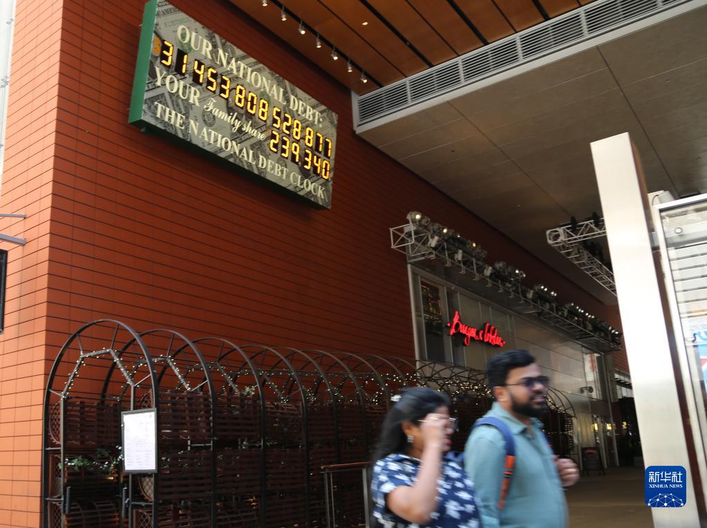 5月29日,人們經(jīng)過(guò)美國紐約曼哈頓的“國債鐘”?!皣鴤姟笔且粋€(gè)大型計數器,它實(shí)時(shí)更新美國的公共債務(wù)總額,并顯示出每個(gè)美國家庭所要負擔的數額。