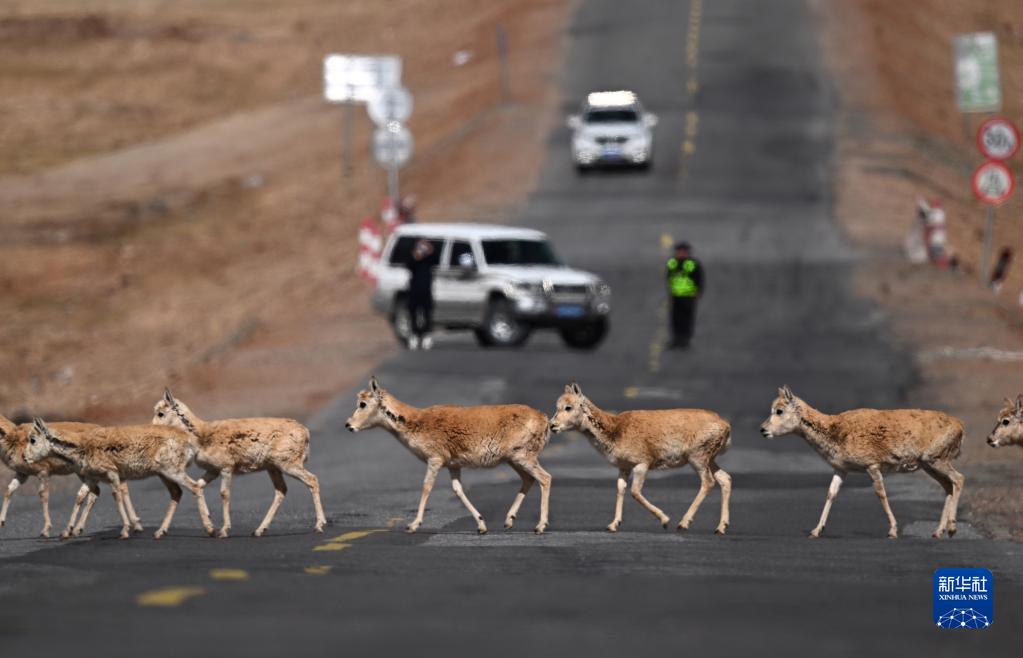 5月28日,在青??煽晌骼?,一群雌性待產(chǎn)藏羚羊通過(guò)青藏公路。
