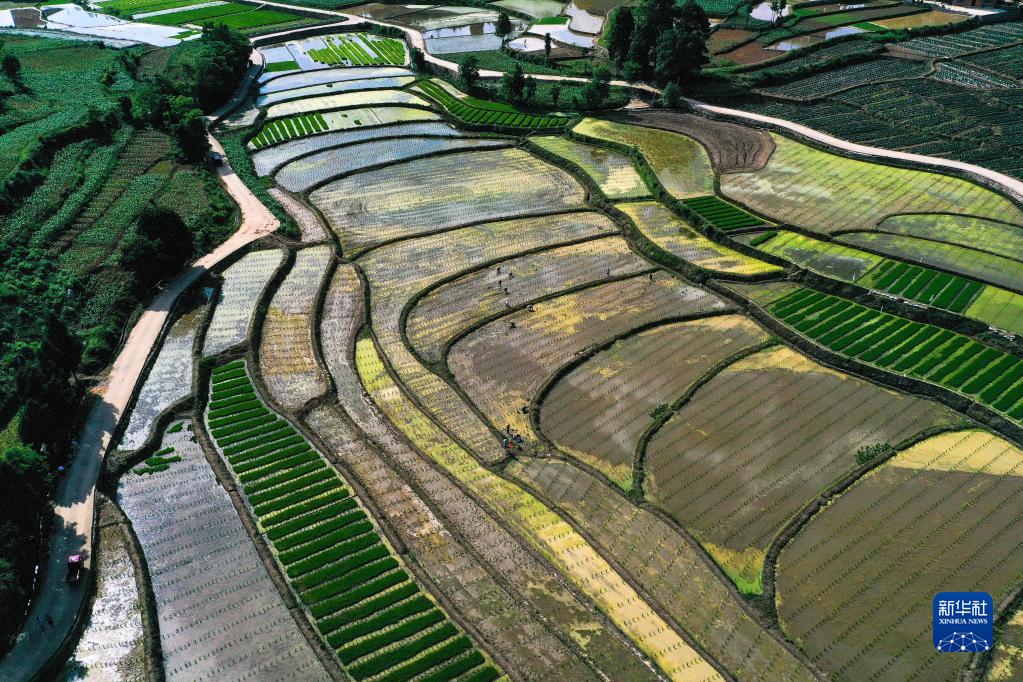 5月29日,村民在岑鞏縣水尾鎮新場(chǎng)村的雜交水稻制種基地移栽制種水稻秧苗(無(wú)人機照片)。