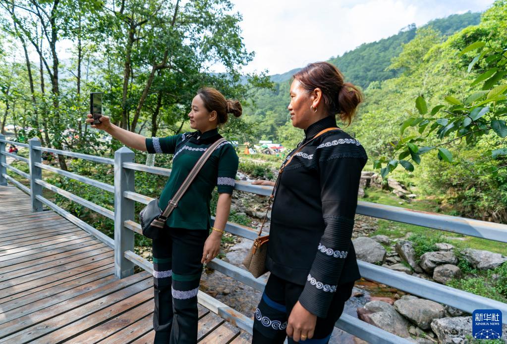 5月29日,兩名游客在坪河草地景區自拍留念。