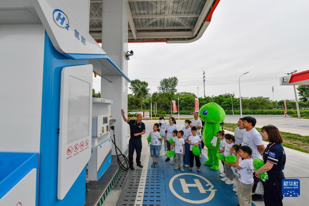 5月30日,在天津空港經(jīng)濟區西十四道綜合加能站,工作人員帶領(lǐng)小朋友參觀(guān)加氫設備。