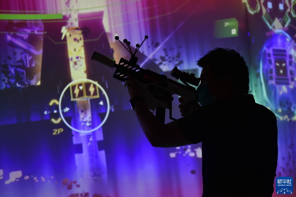 5月30日,在科幻產(chǎn)業(yè)新技術(shù)新產(chǎn)品展上,一名參觀(guān)者在體驗運用動(dòng)作捕捉等技術(shù)的虛擬游戲。