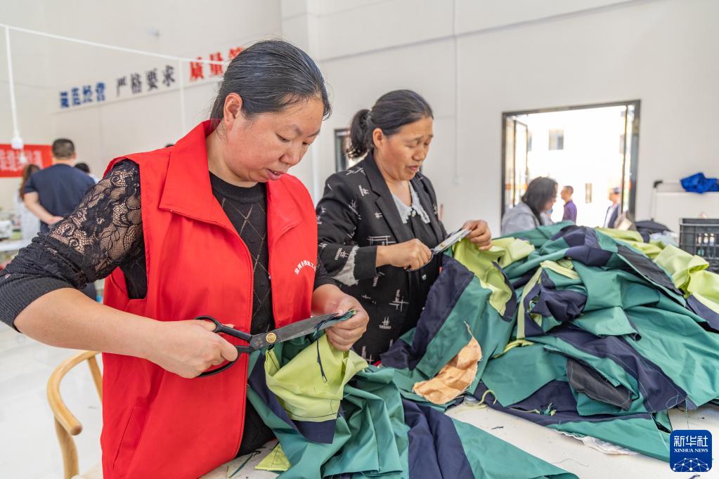 5月30日,在重慶市城口縣沿河鄉服裝加工工坊,村民在成品服裝出廠(chǎng)前做最后的處理。