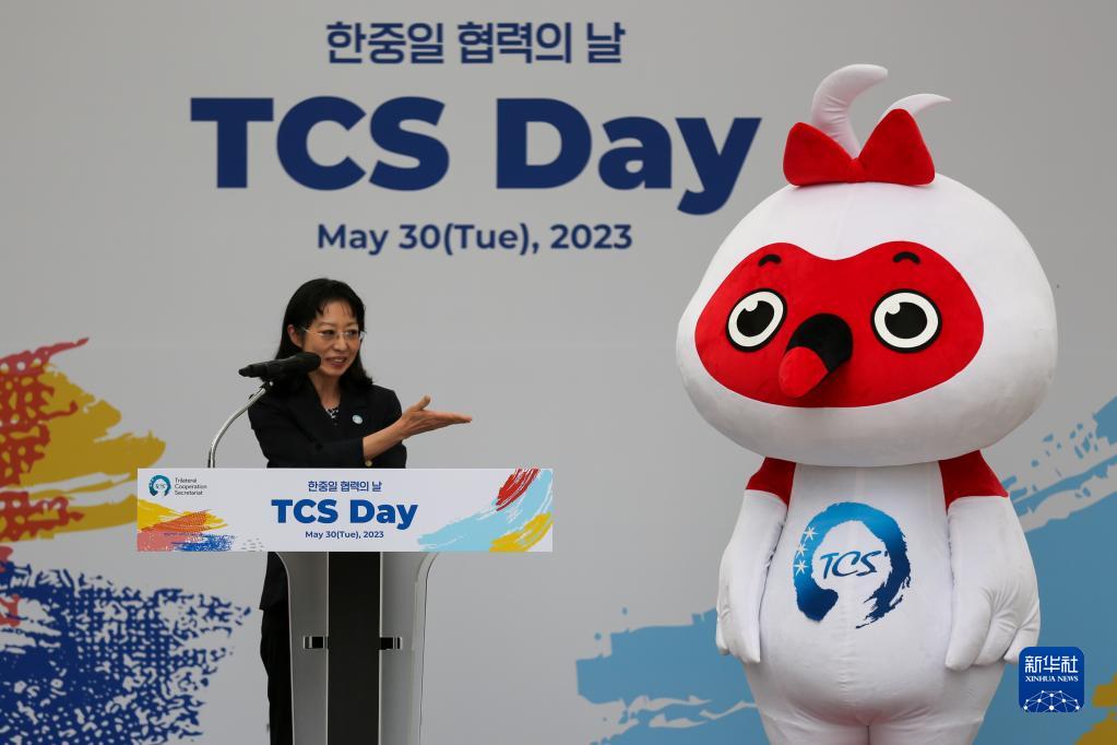 5月30日,在韓國首爾舉辦的“中日韓合作之日”慶?;顒?dòng)中,中日韓合作秘書(shū)處副秘書(shū)長(cháng)坂田奈津子介紹秘書(shū)處吉祥物。