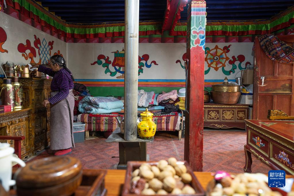 5月28日,洛桑占堆老人的親家卓嘎在自己與女兒、女婿居住的典角村“三代房”客廳里打掃衛生。新華社記者 費茂華 攝