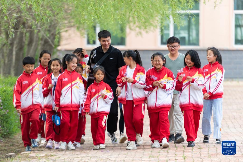 5月29日,在安達市任民鎮中心小學(xué),音樂(lè )老師和音樂(lè )班的孩子在校園中。