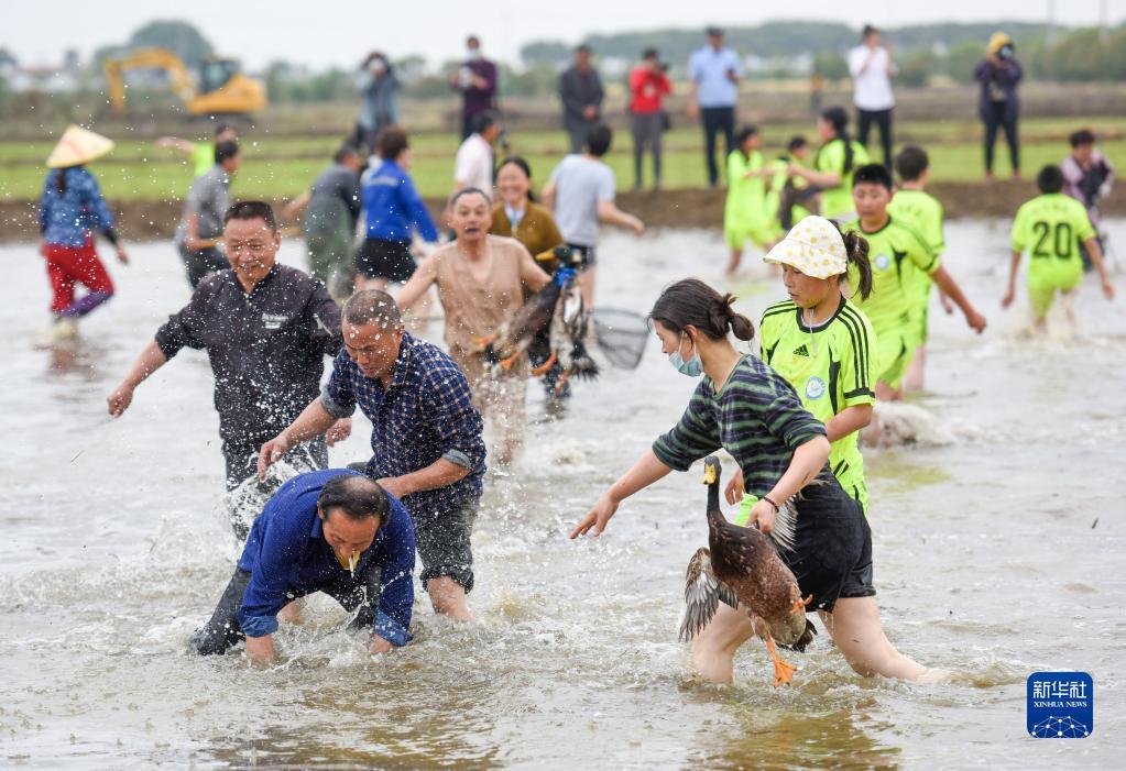 5月30日,在淮安市洪澤區岔河鎮,人們在插秧節上參加抓鴨比賽。