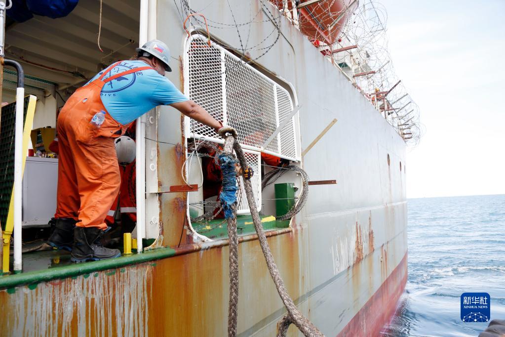 5月30日,聯(lián)合國工程船的船員在該船抵達也門(mén)紅海港口荷臺達附近海域后固定船只。