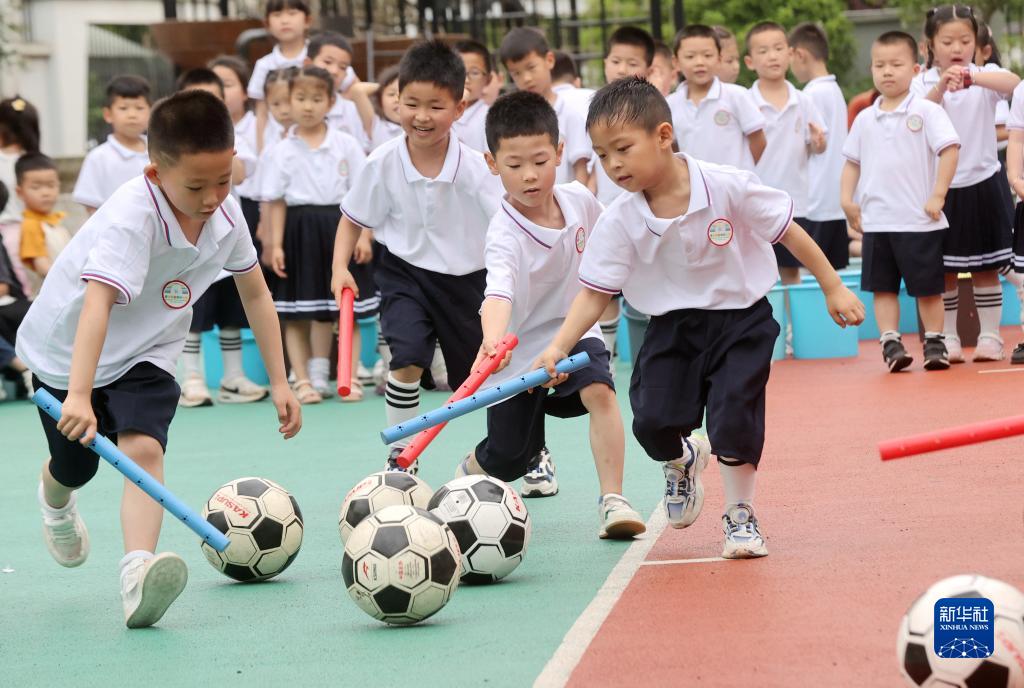 5月31日,浙江省湖州市德清縣三橋幼兒園的孩子們在進(jìn)行“趕小豬”游戲。