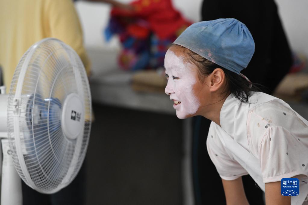 5月30日,伏嶺鎮中心小學(xué)“徽劇童子班”學(xué)生方甜甜在化妝間隙吹電扇。