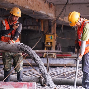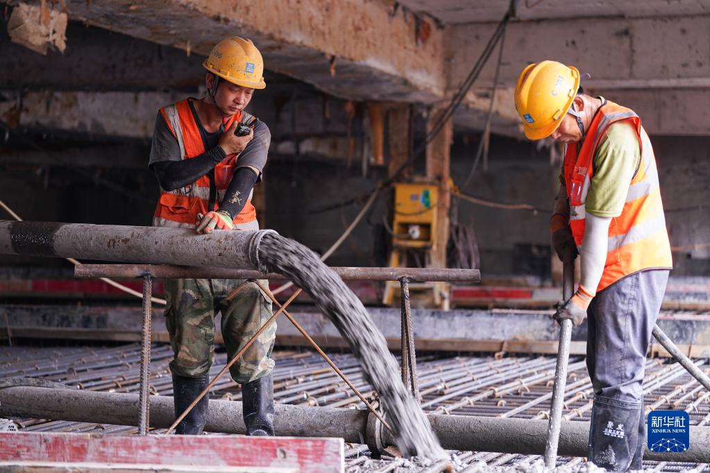 5月30日,中建八局的建筑工人在合肥市軌道交通7號線(xiàn)蓮花路站澆筑。