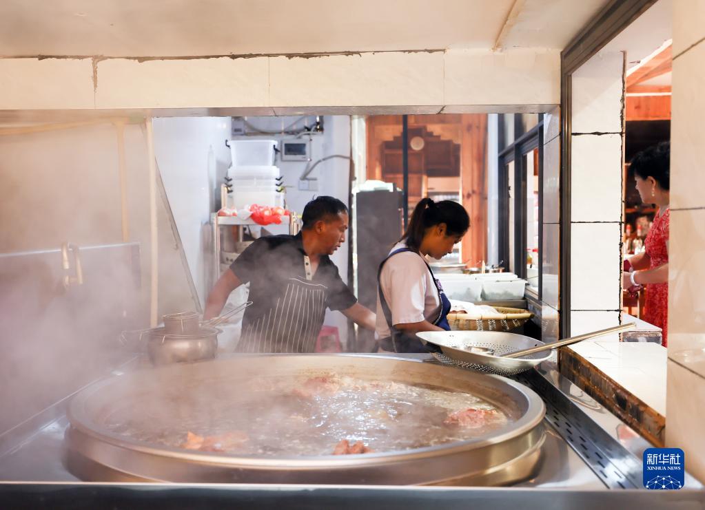 5月31日,普者黑景區仙人洞村一家餐館的工作人員在準備早餐。