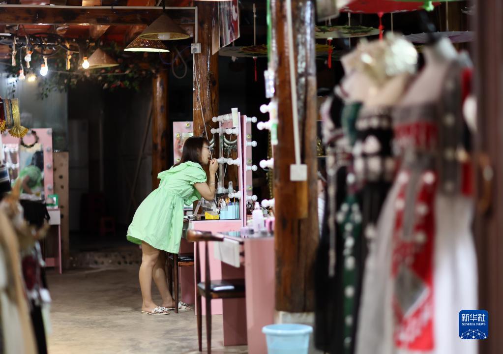 5月30日,游客在普者黑景區仙人洞村一家紀念品店體驗。