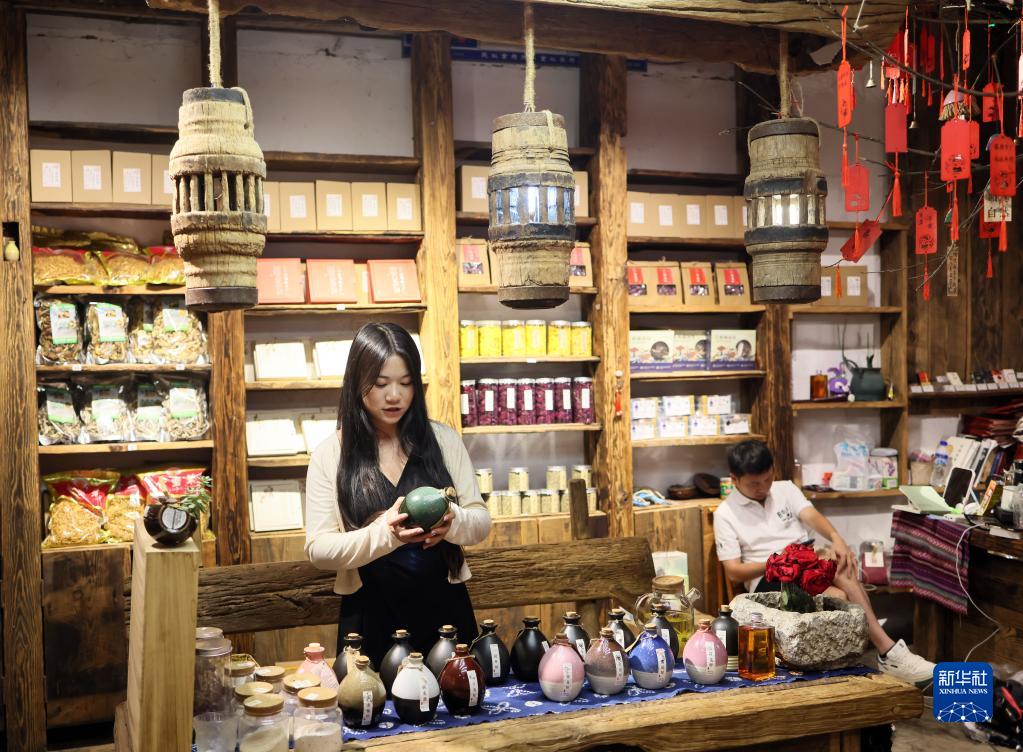 5月30日,在普者黑景區仙人洞村一家特產(chǎn)店,工作人員在介紹商品。