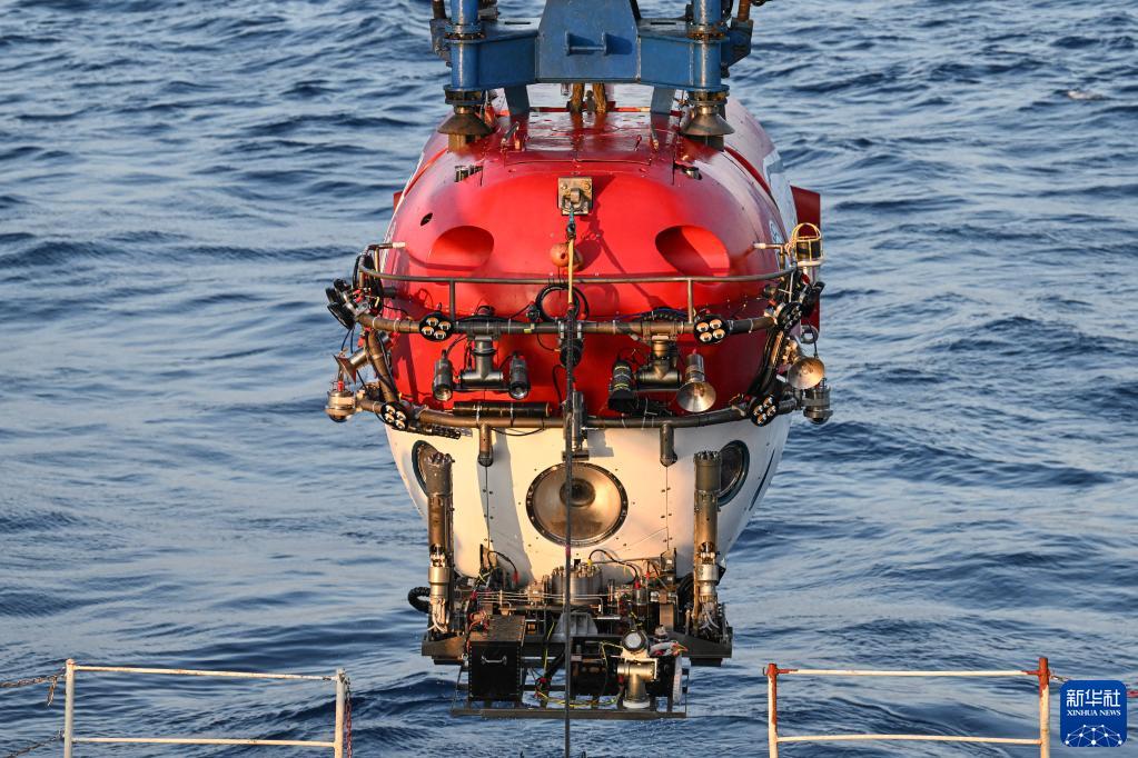搭載著(zhù)考古隊員的“深海勇士”號載人潛水器從“探索一號”科考船下放至海面,即將下潛開(kāi)始當日的水下調查(5月24日攝)。