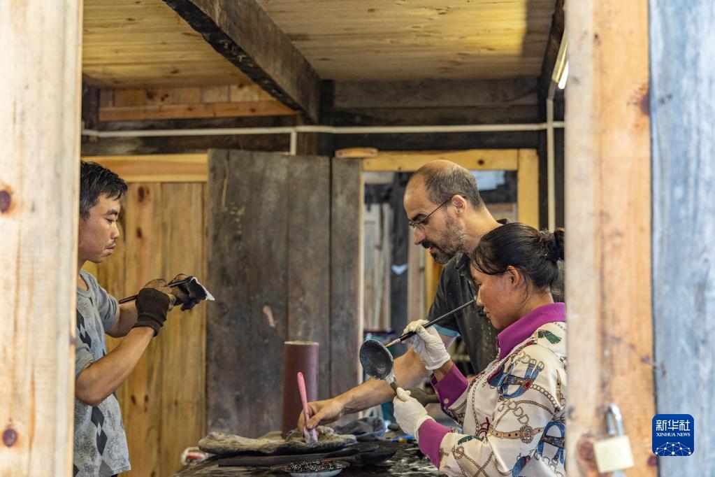 5月29日,在重慶市城口縣北屏鄉松柏村,文森·漆在工作室與當地村民給作品上漆。