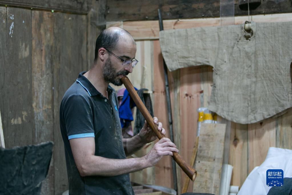 5月29日,在重慶市城口縣北屏鄉松柏村,文森·漆在創(chuàng )作間隙吹奏尺八。