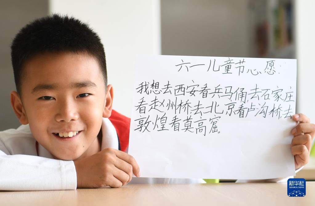河北雄安新區容東片區容和悅容小學(xué)三年級四班高啟洋展示“六一”微心愿(5月24日攝)。