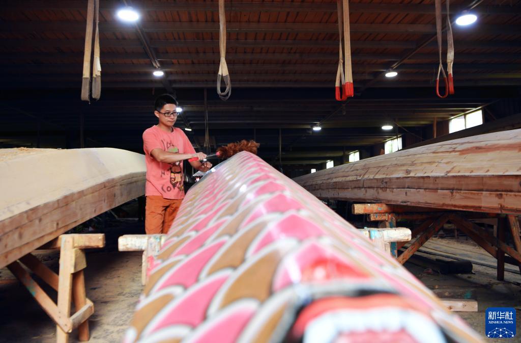 5月31日,福州市閩侯縣南通鎮方莊村方忠雄龍舟廠(chǎng)的方劍偉擦拭新龍舟進(jìn)行。