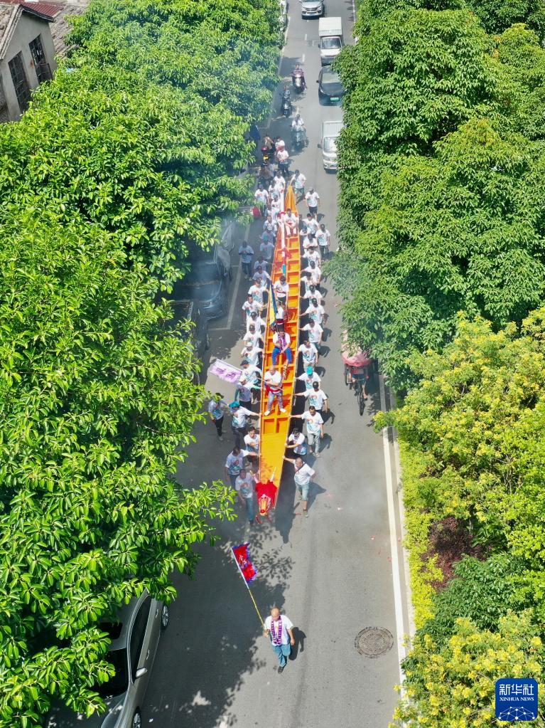 5月31日,福州市連江縣龍舟愛(ài)好者在運送新龍舟(無(wú)人機照片)。
