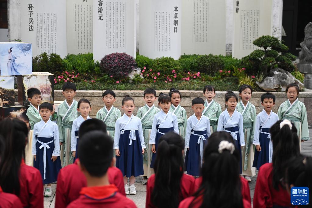 5月31日,在浙江省湖州市吳興區八里店鎮潞村“典籍里的中國”陳列館門(mén)口,參加“誦讀國學(xué)經(jīng)典 傳承華夏氣韻”主題活動(dòng)的小學(xué)生集體誦讀國學(xué)篇目。