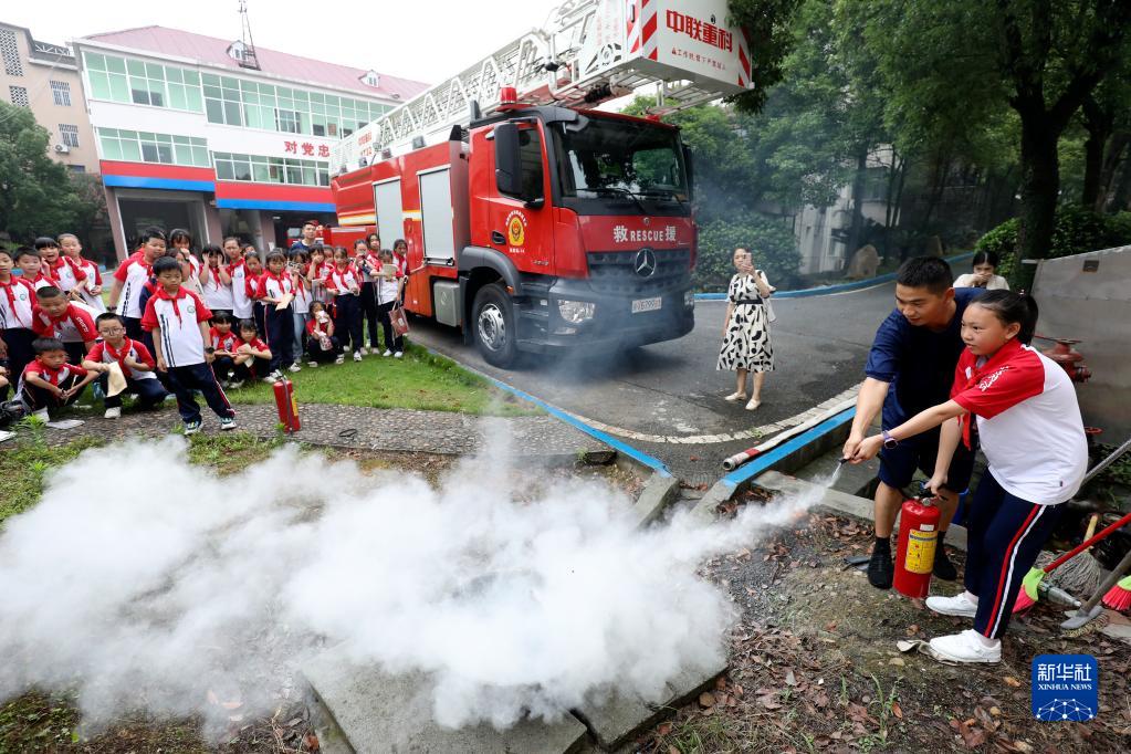 5月31日,在湖南省資興市消防救援大隊舉辦的開(kāi)放日活動(dòng)上,小朋友在消防員指導下學(xué)習使用滅火器。