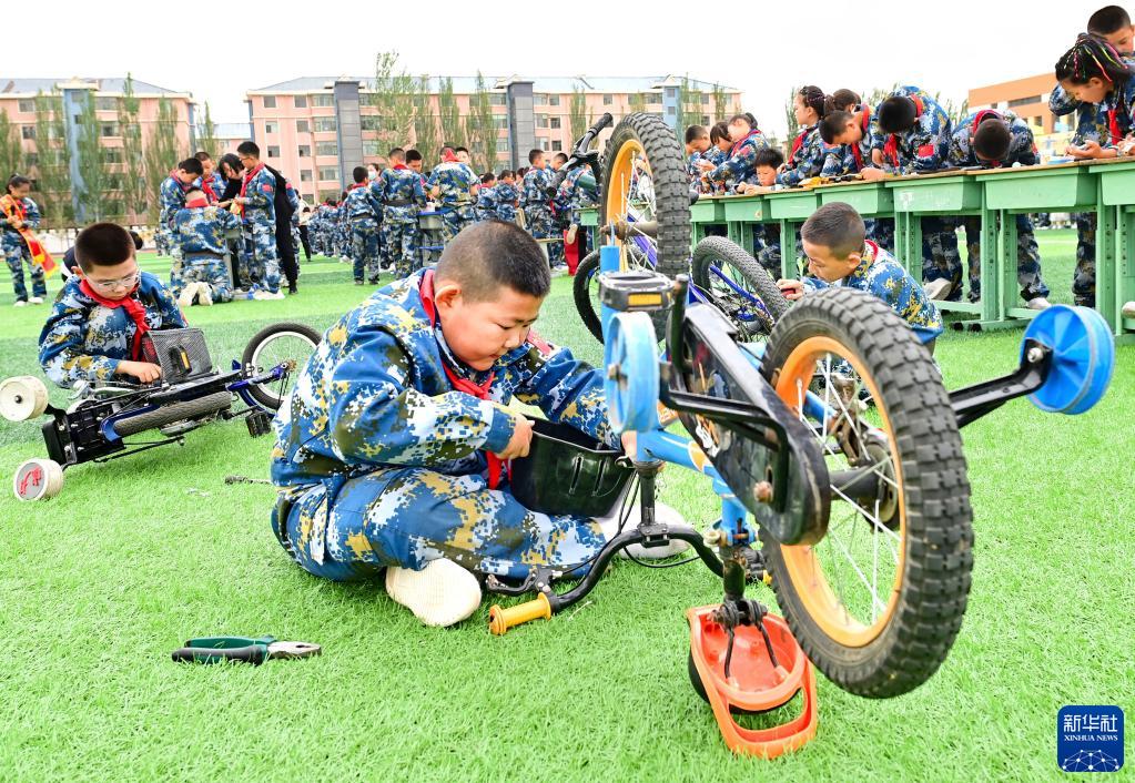 5月31日,內蒙古鄂爾多斯市鄂托克前旗第四小學(xué)學(xué)生在“我勞動(dòng) 我快樂(lè )”主題活動(dòng)中修理自行車(chē)。