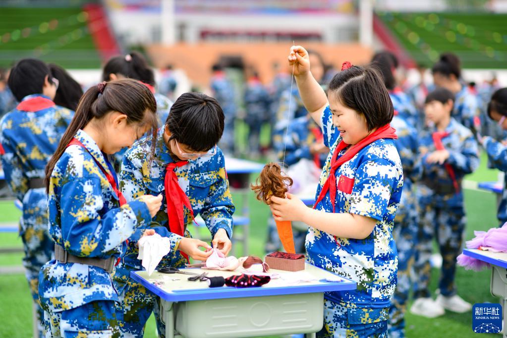 5月31日,內蒙古鄂爾多斯市鄂托克前旗第四小學(xué)學(xué)生在“我勞動(dòng) 我快樂(lè )”主題活動(dòng)中制作玩具。