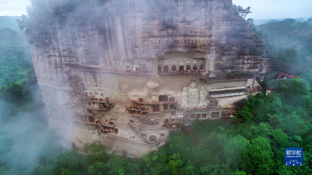 這是5月31日拍攝的煙雨籠罩下的麥積山石窟(無(wú)人機照片)。