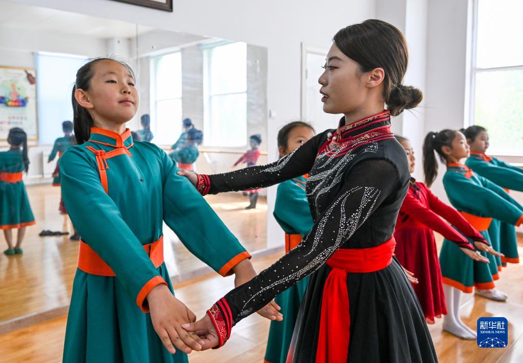 5月31日,蘇尼特右旗烏蘭牧騎隊員(前右)為“小小烏蘭牧騎”隊員傳授舞蹈技巧。