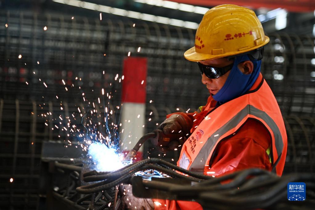 5月31日,中鐵十一局施工人員在西十高鐵鋼構件加工廠(chǎng)加工作業(yè)。