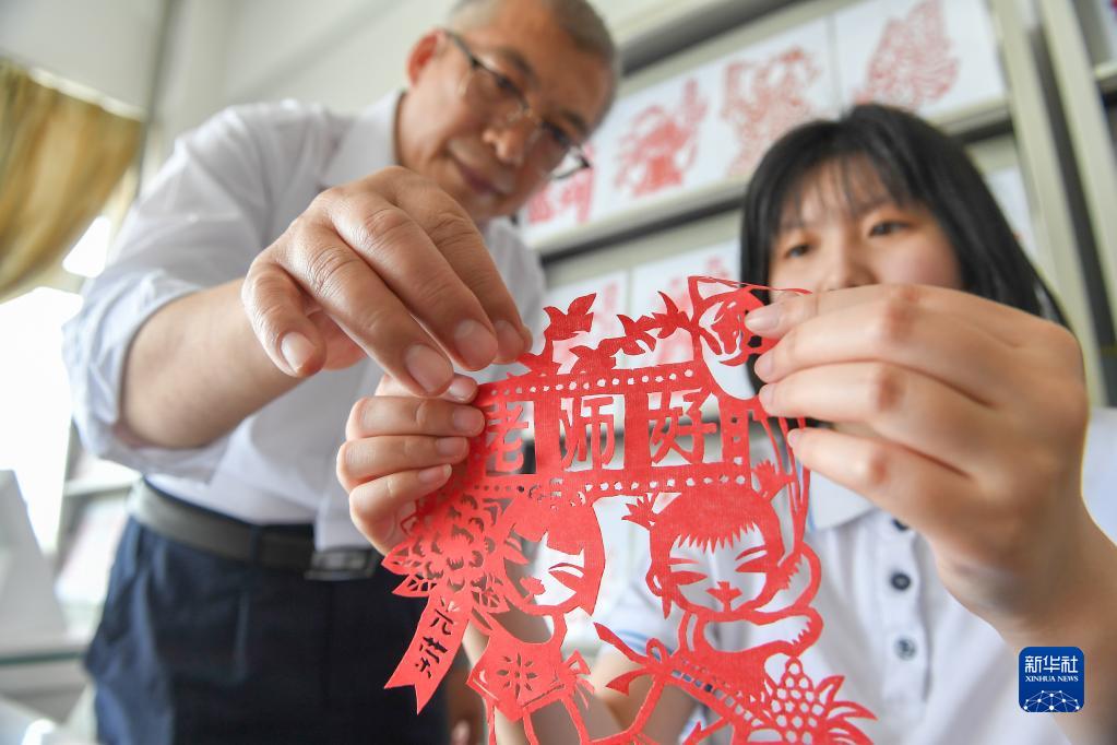 5月31日,在四平市聾啞學(xué)校,教師霍明燚(左)與殘障學(xué)生展示紙刻作品。