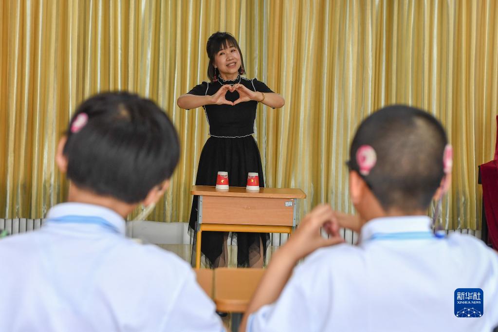 5月31日,在四平市聾啞學(xué)校,教師李洪敏(中)為殘障學(xué)生們上律動(dòng)課。