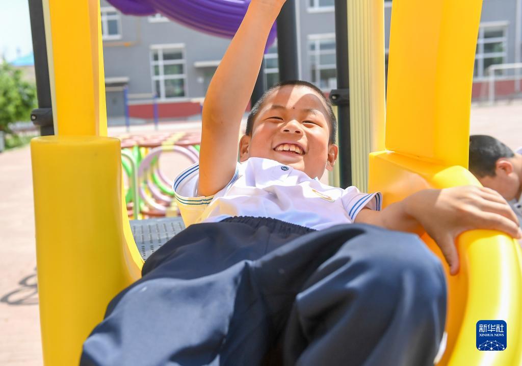 5月31日,在四平市聾啞學(xué)校,一位殘障學(xué)生在玩滑梯。