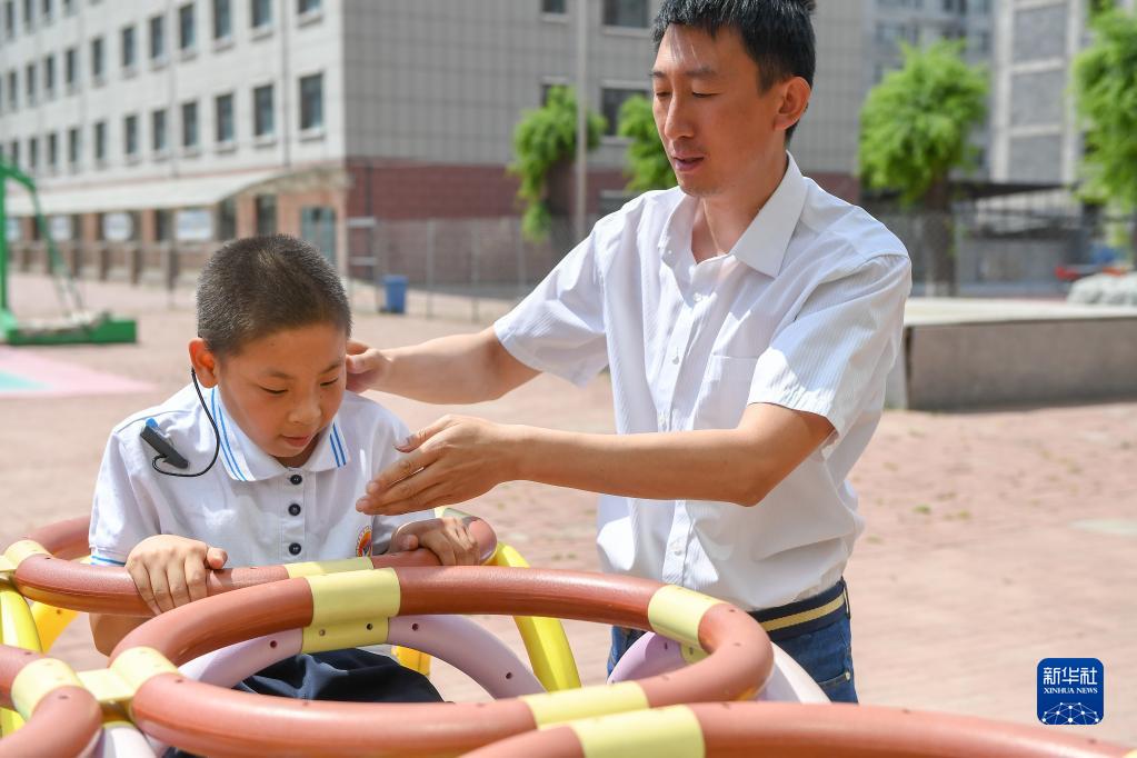 5月31日,在四平市聾啞學(xué)校,教師李瑞楠(右)陪伴殘障學(xué)生進(jìn)行課間游戲。