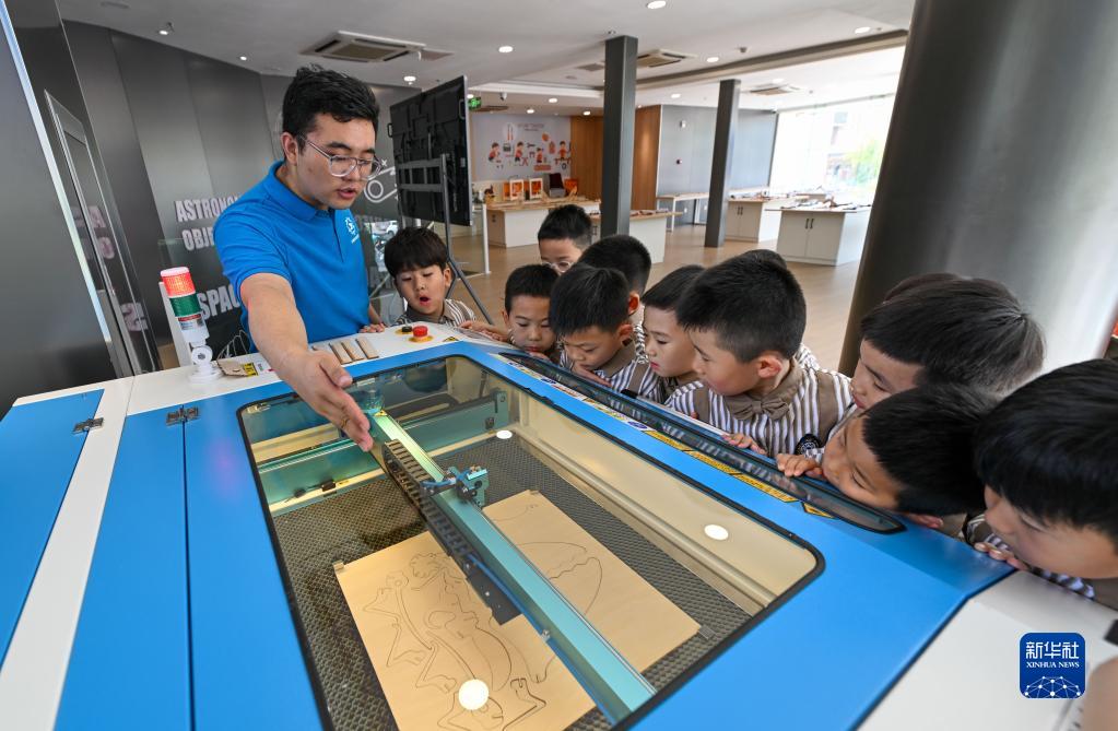 6月1日,在天津華夏未來(lái)兒童科技館,孩子們在老師的帶領(lǐng)下觀(guān)看3D激光切割。