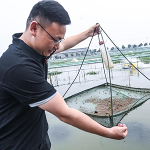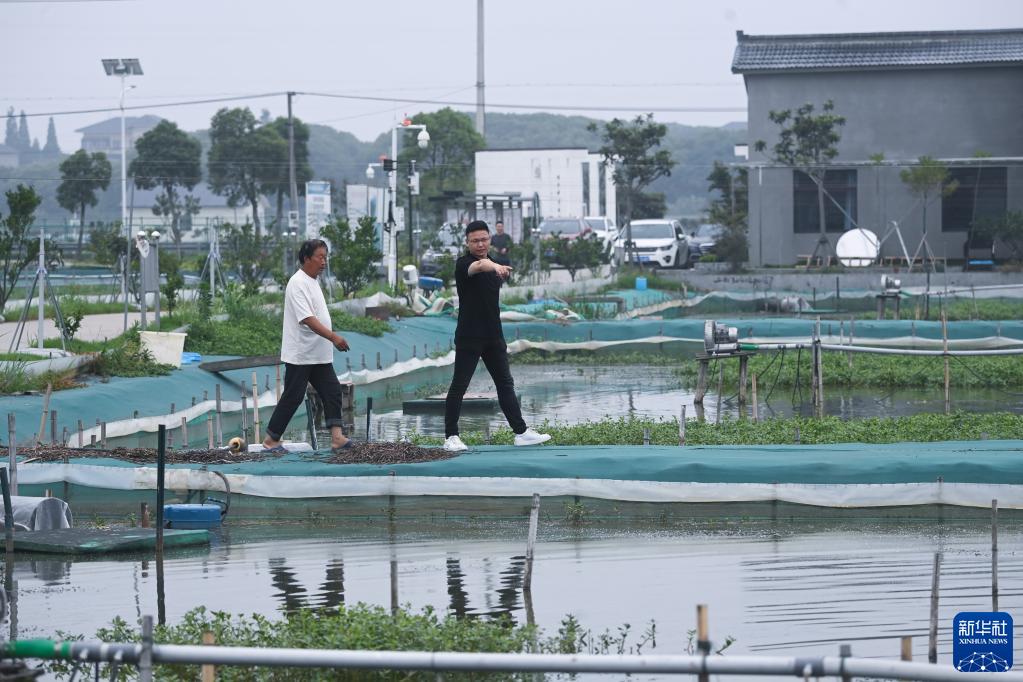 6月1日,欒金祥(右)在浙江省湖州市織里鎮湖星農業(yè)科技有限公司的湖蟹養殖基地內查看湖蟹的生長(cháng)情況。欒金祥是美國紐約州立大學(xué)碩士畢業(yè),回國后在家鄉投身現代農業(yè)管理,帶動(dòng)蟹農創(chuàng )收,2022年公司湖蟹養殖銷(xiāo)售額達5000萬(wàn)元人民幣。